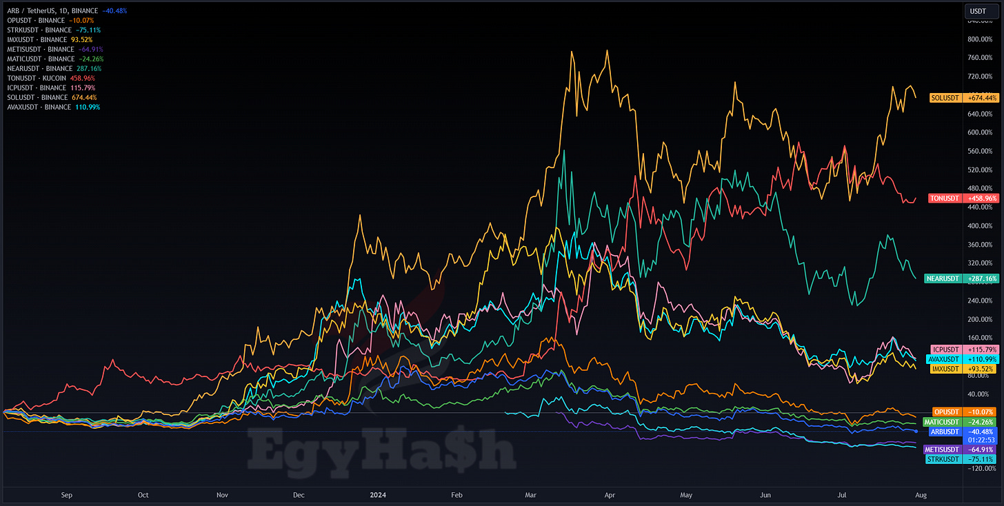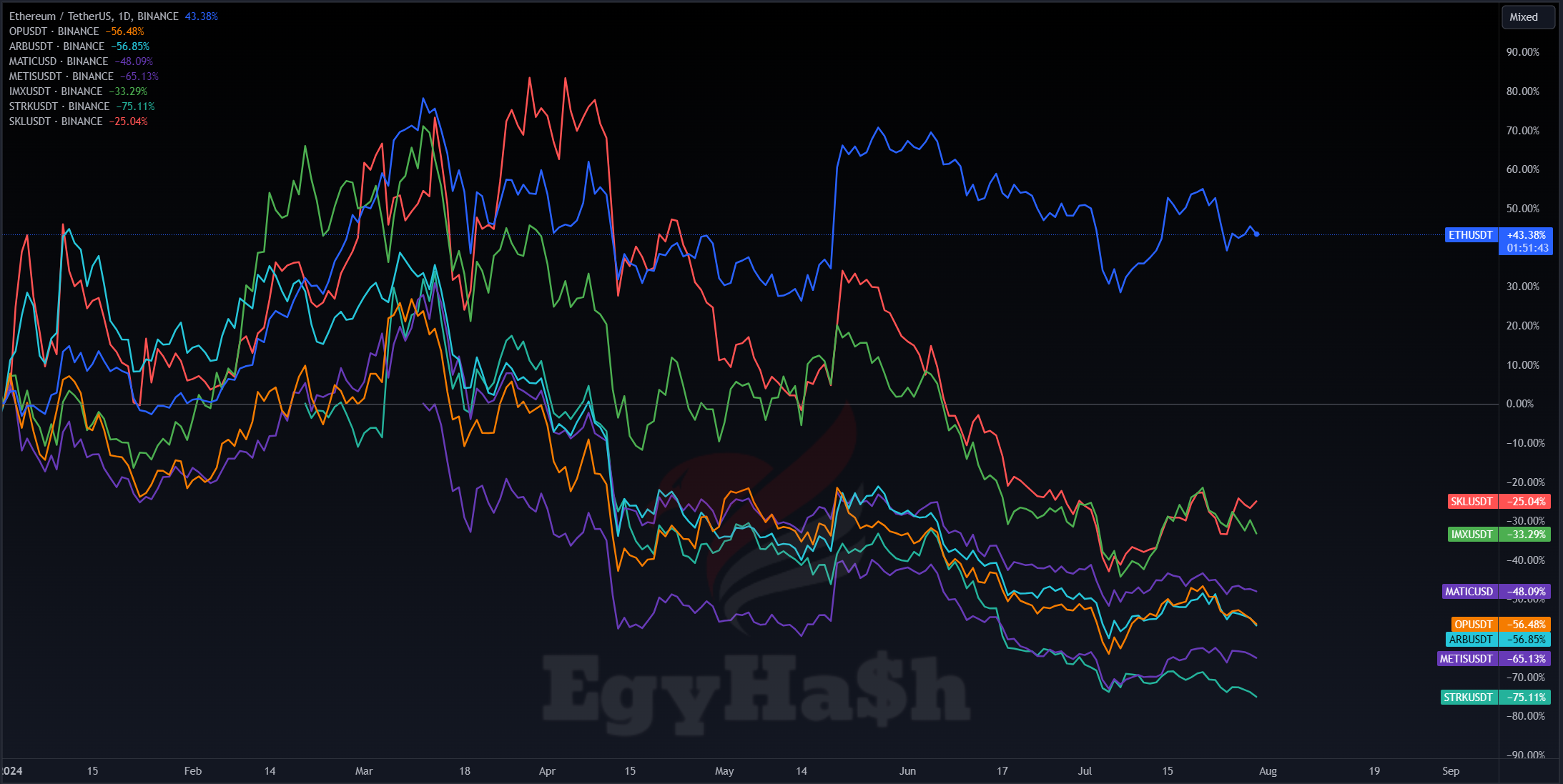 ليس هذا فحسب؛ بل إن معظم عملات الطبقات الثانية منذ إطلاقها أعطت عائدًا سالبًا مقارنةً بالإيثريوم. ومنذ بداية العام الحالي كان العائد من الاستثمار في عملات الطبقات الثانية جميعها سلبيًا، وعملة الإيثريوم هي الوحيدة التي أعطت عائدًا إيجابيًا.