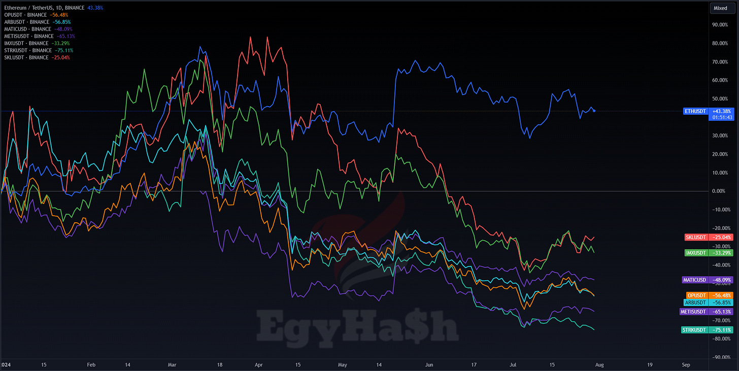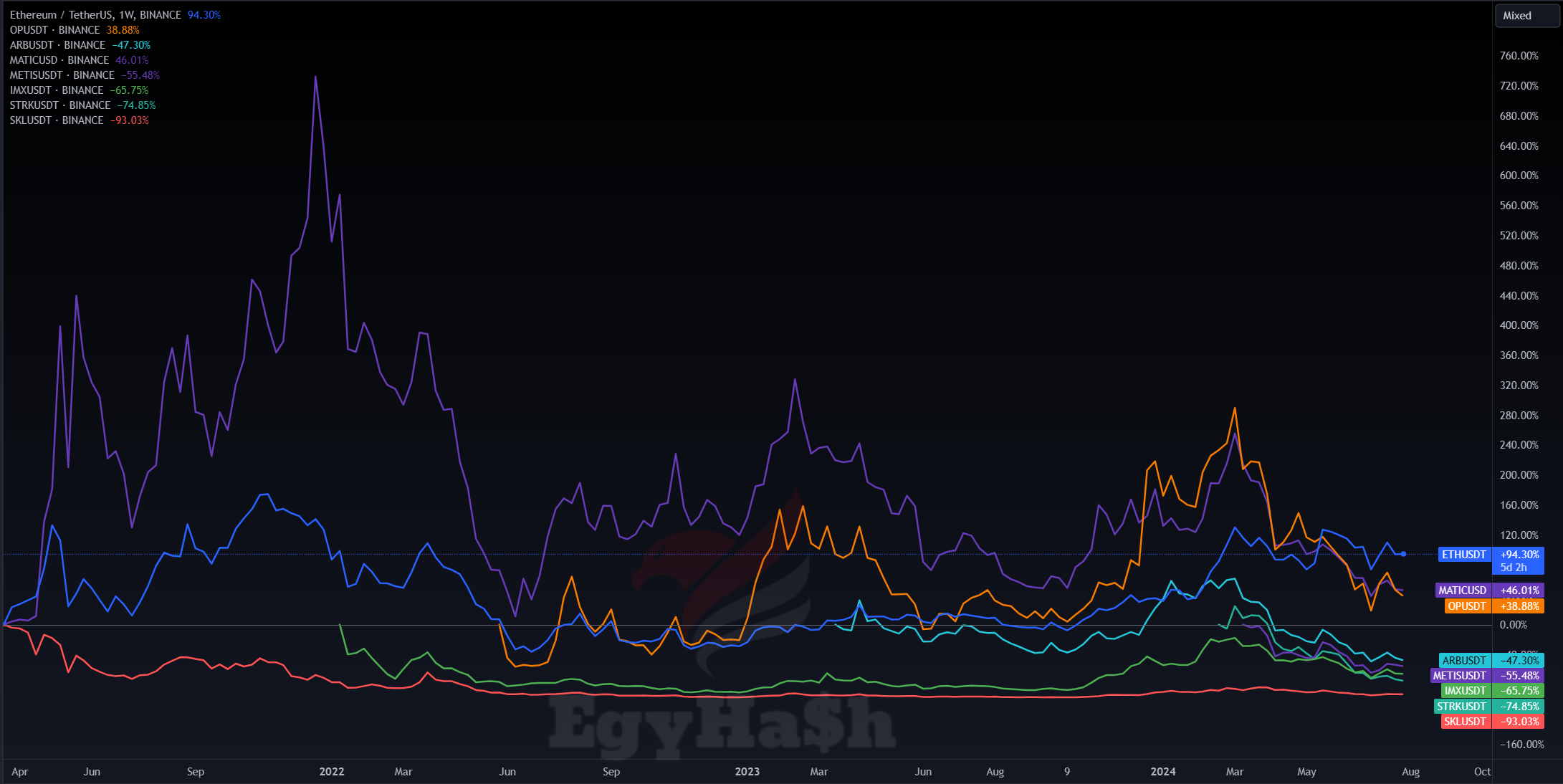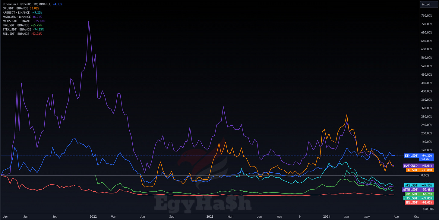 المخطط بالأعلى عبارة عن مقارنة للأداء السعري بين عملة الإيثريوم وأشهر عملات الطبقات الثانية على الإيثريوم خلال مدة 3 سنوات. هل تلاحظ شيئًا ما؟