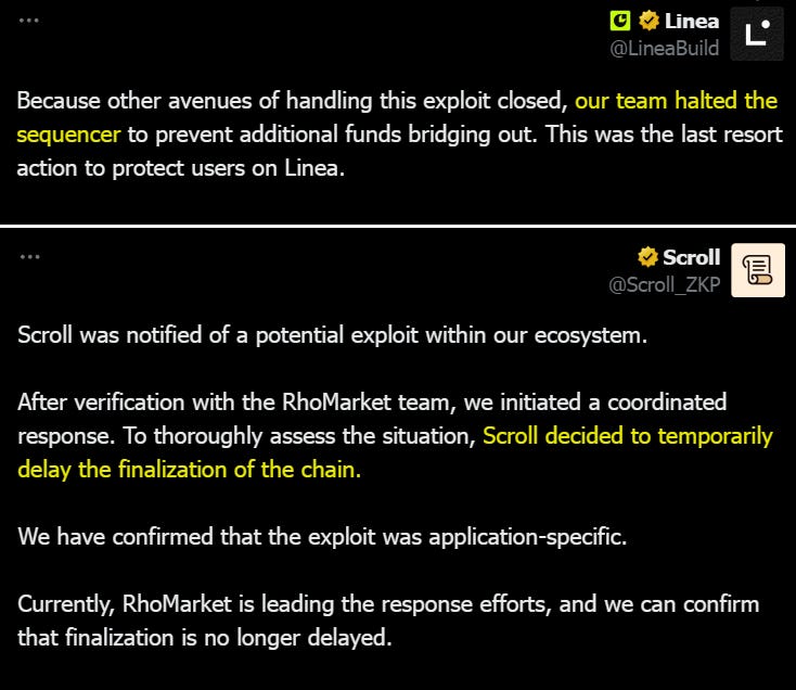 ليس هذا فحسب؛ بل توقف شبكات الطبقة الثانية هو شيء يحدث بشكل متكرر. مثلًا شبكة Arbitrum توقفت العام الماضي ثلاث مرات. وهذا العام توقفت شبكات Base | Blast | Scroll | Linea وغيرهم عن العمل لأسباب تقنية مختلفة.