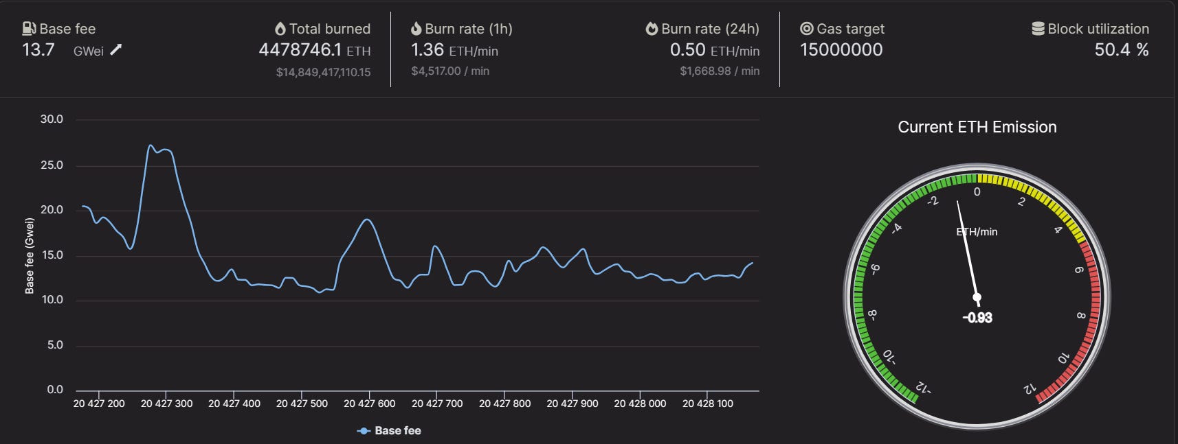 بسبب انخفاض النشاط على الطبقة الأولى، وانخفاض رسوم معاملات الطبقات الثانية نتيجة لتحديث Dencun، انخفض معدل حرق الإيثريوم. فبعد تحديث EIP-1559 يتم حرق رسوم المعاملات الأساسية على شبكة الإيثريوم.